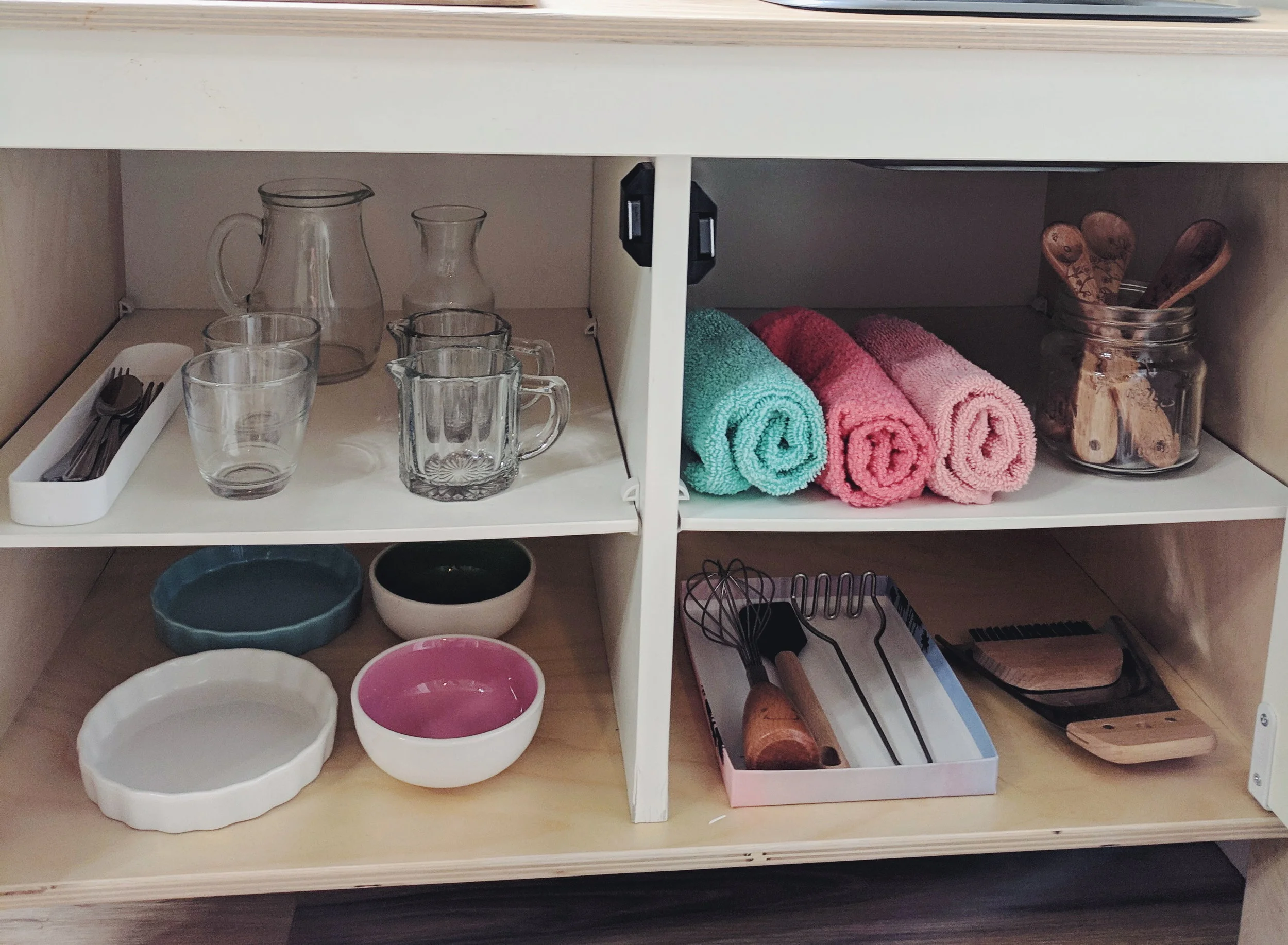 The other big difference between this functional kitchen and a play kitchen is the cupboard. Instead of pretend food and pots/pans, I filled the cupboards with utensils, dishes, and cleaning supplies she uses on a daily basis. On the left she has her spoons and forks, glasses, pitchers, plates, and bowls. I only put a couple of each item out, so that if she wants to “reorganize”, it’s not so overwhelming and doesn’t create a big mess. She likes to help unload the dishwasher each morning and put her dishes back in their place, or at least in the vicinity. ;)